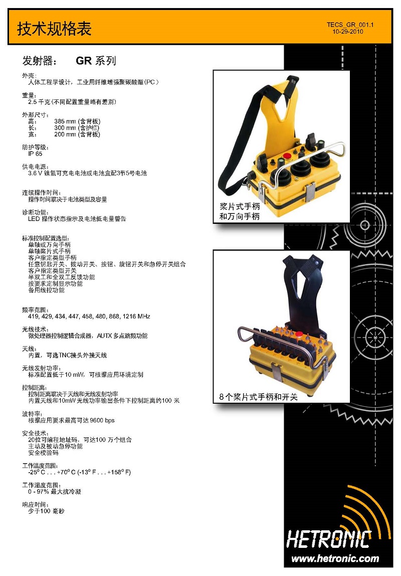 简述: GR系列发射器是HETRONIC遥控器中非常坚固而强大的典型。它在发射器外壳的上半部分和下半部分之间围绕着一圈橡胶保护圈,为您的遥控器安全提供额外保护。实用的设计为众多的功能提供了足够的空间,您可以根据需要在GR发射器面板上安装挖掘机操作杆、摇杆、旋转电位计、选择开关、按钮等等...LED或LCD反馈功能可以让你方便地看到机器运行状态的重要数据。