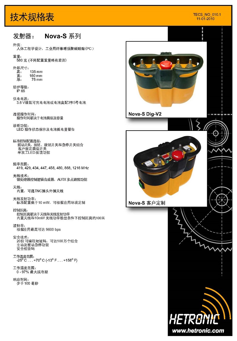 简述: NOVA系列发射器是专门为开关量和比例量应用而生的无线遥控器。该系列发射器包括四种大小不一的外壳,根据外壳尺寸大小(S,M,L,XL)分别为NOVA-S/M/L/XL.它们都具有相同的符合人体工程学的外形。圆角的外形和良好的用户界面,使NOVA系列不仅仅只是一款漂亮的产品,同时也极具人性化和强大的功能。