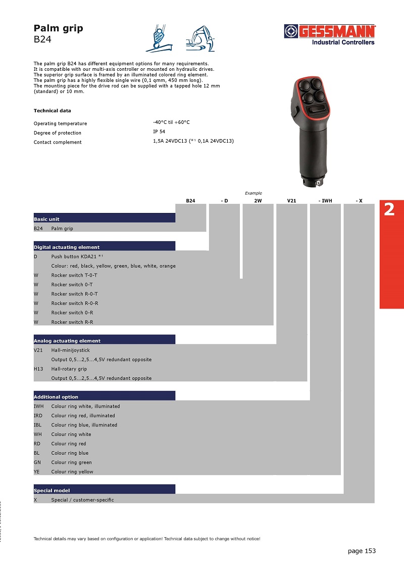 简述: B24握把拥有不同的零件选择满足许多应用需求。它可以兼容多种多轴控制杆或者安装在液压驱动上。B24握把有一股非常柔韧的电缆线(0.1mm²,450mm长)。安装孔只需要直径12mm(标准)或10mm的孔。
