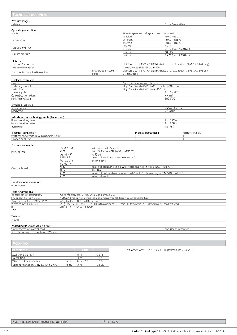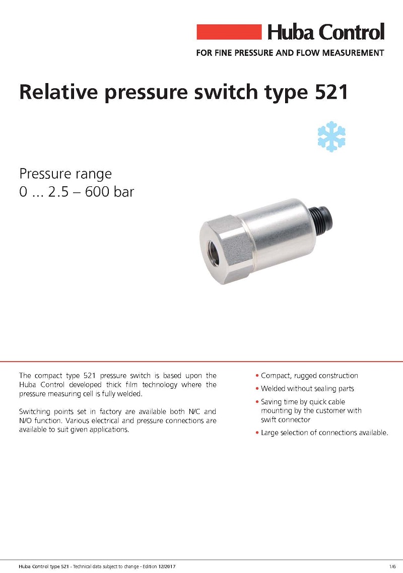 简述: 紧凑型521压力开关基于Huba Control开发的厚膜技术,压力测量单元是焊接的。工厂设置的切换点有N / C和N / O功能。 各种电气和压力连接适用于特定应用。
