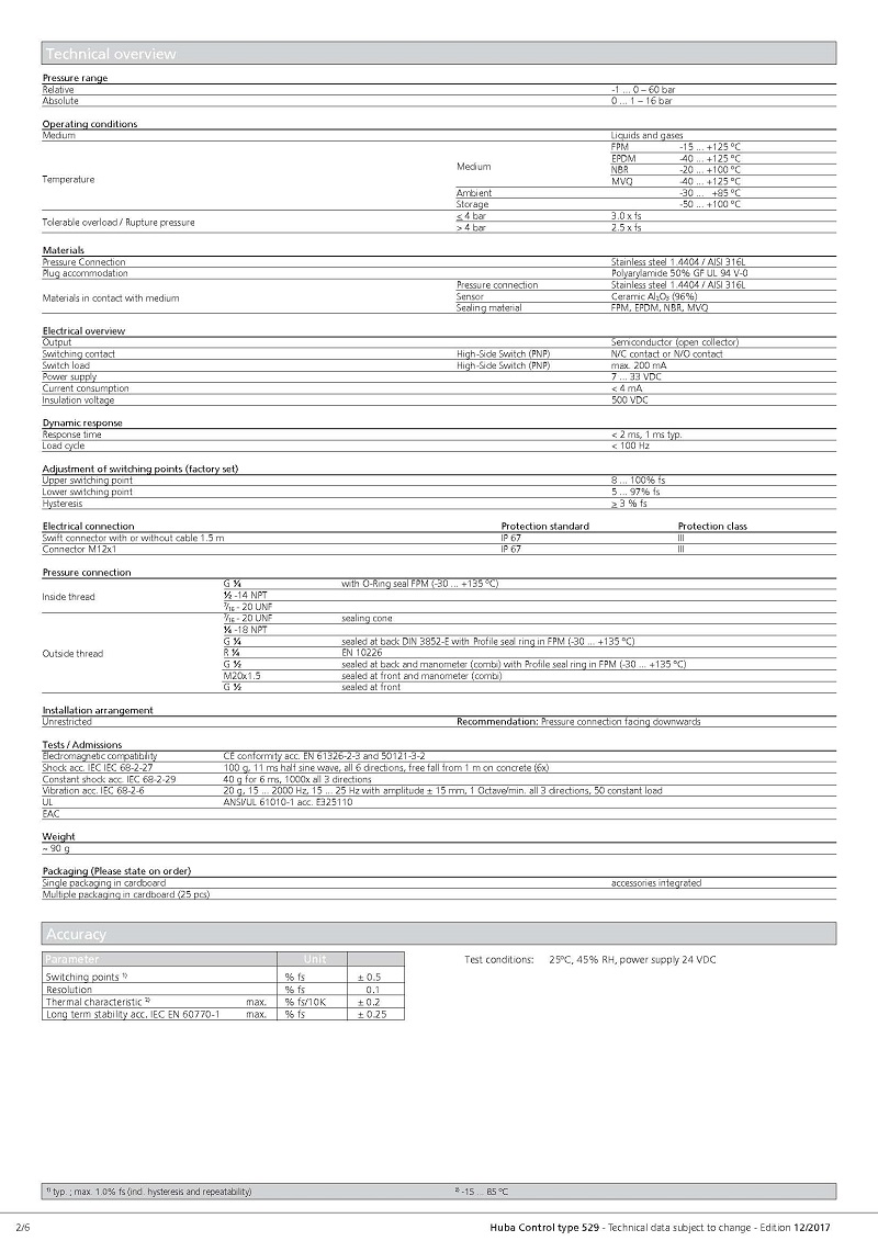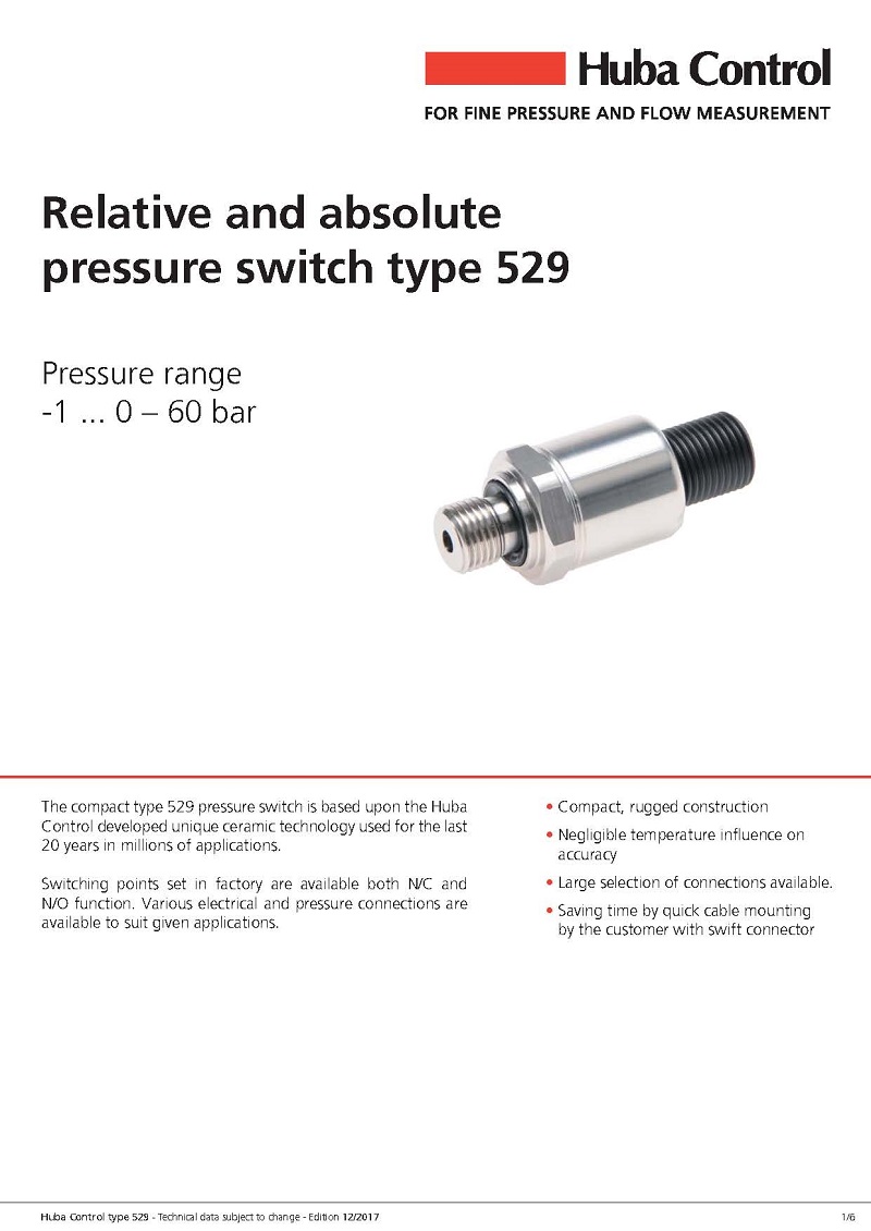 简述: 紧凑型529压力开关基于Huba Control开发出独特的陶瓷技术,该技术已有20年历史,并有数百万应用案例。工厂设置的切换点有N / C和N / O功能。 各种电气和压力连接适用于特定应用。