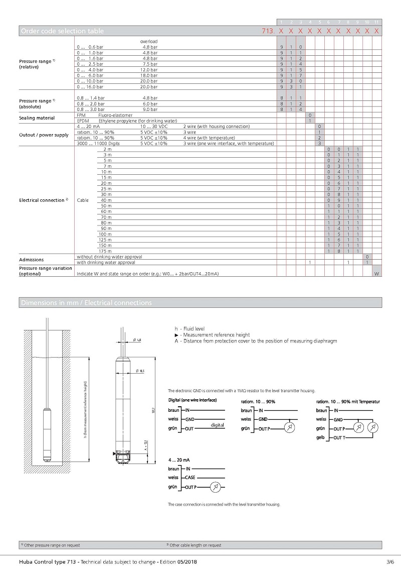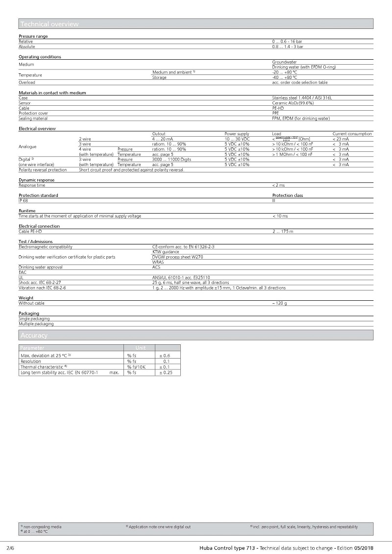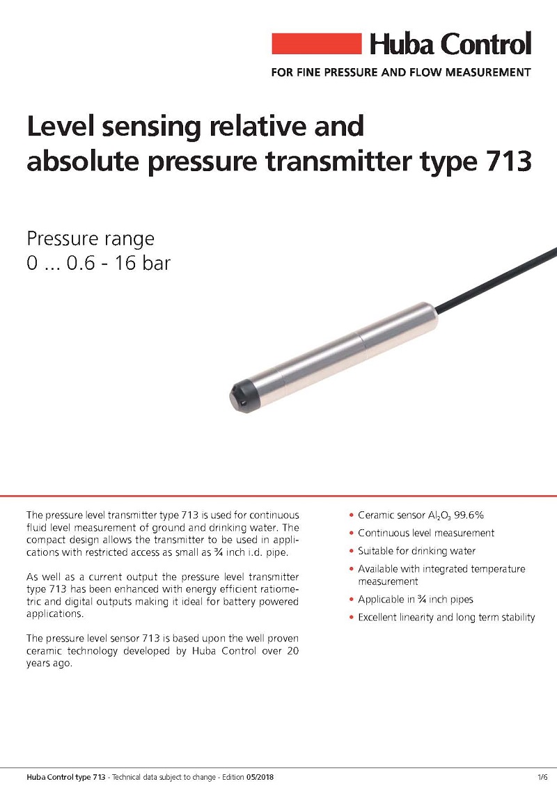 简述: 713型压力水平变送器用于地面和饮用水的连续液位测量。该紧凑的设计允许变送器应用于非常小的空间通道内,比如¾英寸i.d.管。除了压力水平变送器的电流输出外,713型增强了节能比率和数字输出使其成为电池供电应用的理想选择。713型压力水平传感器是基于经过20多年充分证明的由Huba Control开发的陶瓷技术而开发的。