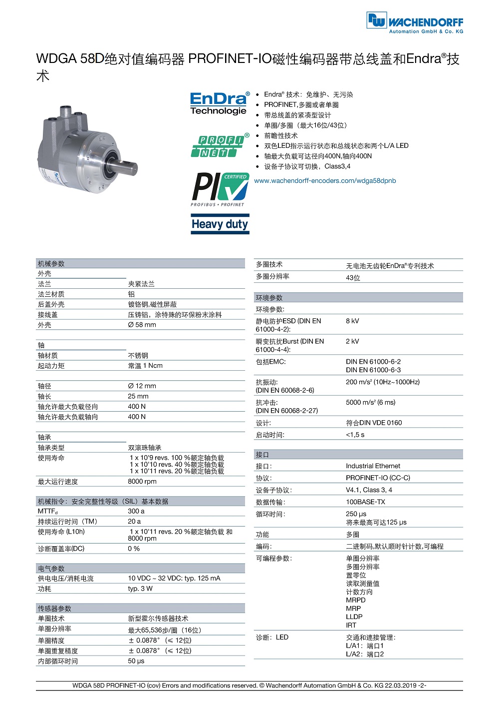 简述: Endra® 技术:免维护、无污染 PROFINET,多圈或者单圈 带总线盖的紧凑型设计 单圈/多圈(最大16位/43位) 前瞻性技术 双色LED指示运行状态和总线状态和两个L/A LED 轴最大负载可达径向220N,轴向120N 设备子协议可切换,Class3,4